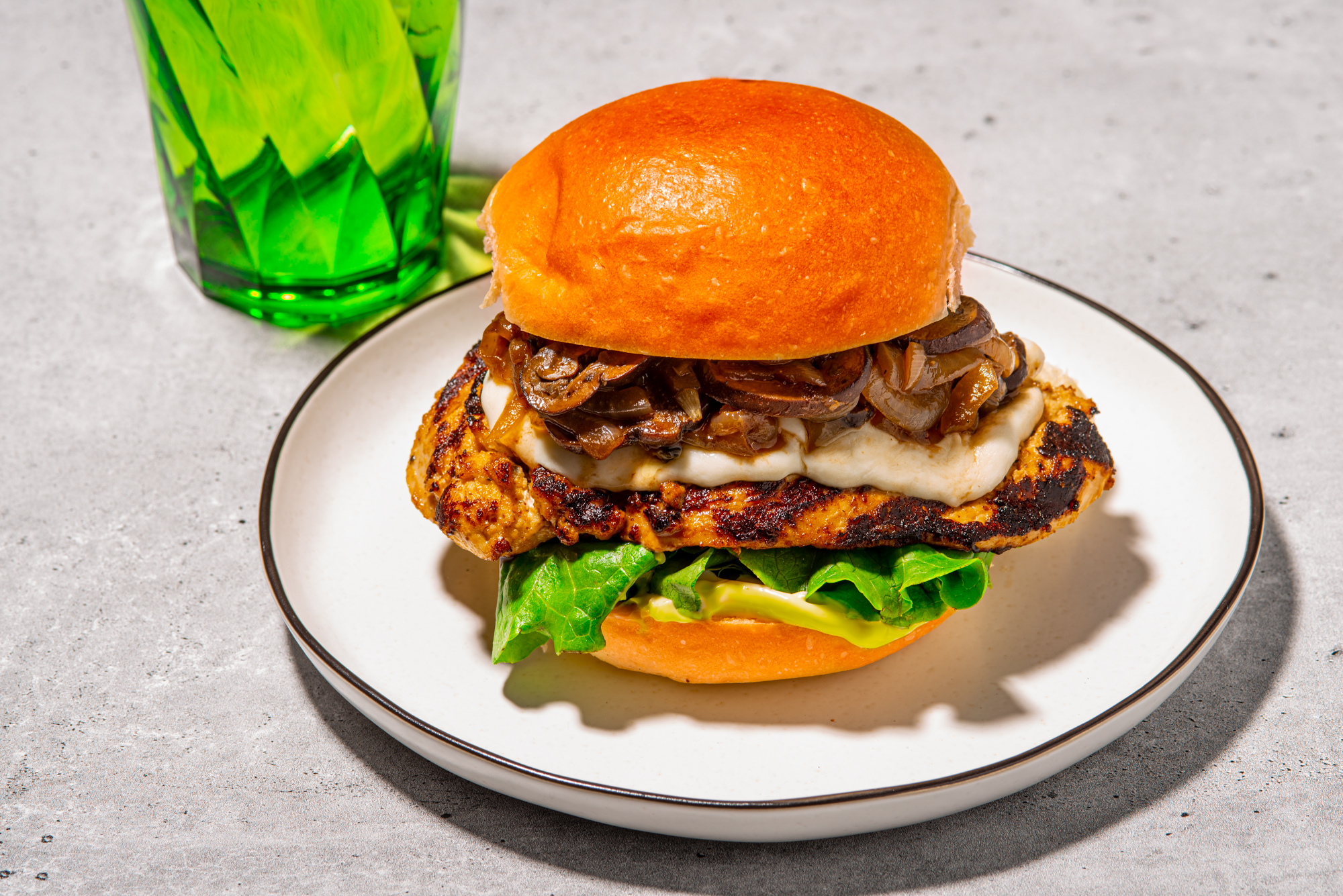 Lightly toast brioche buns. Spread herb mayo on both side on each bun. Add chicken breast and top with marsala onions and arugula. Eat up!